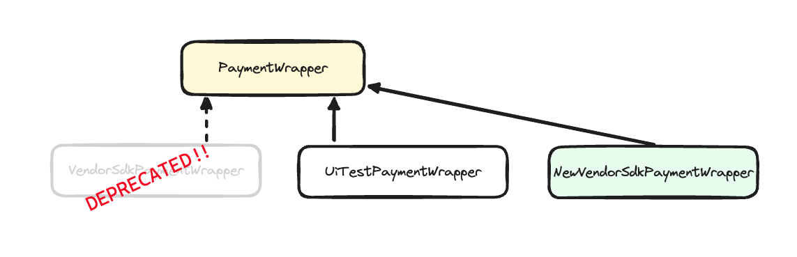 As mentioned before, this approach also solves the problem of migrating from one vendor to another. Instead of rewriting everything, we only need to add another implementation of PaymentWrapperthat adheres to the interface of the new vendor SDK. Each feature's existing implementation and tests will be untouched because the interface never changes.