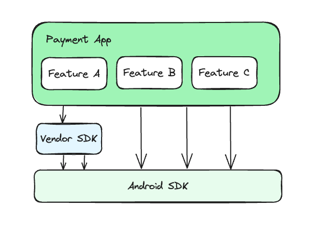 This implementation looks fine. The FeatureA module has access to VendorSdk, which in turn has access to the device's hardware for making payments. But notice how FeatureA has to adapt VendorSdk's interface which in this case is a callback function.
