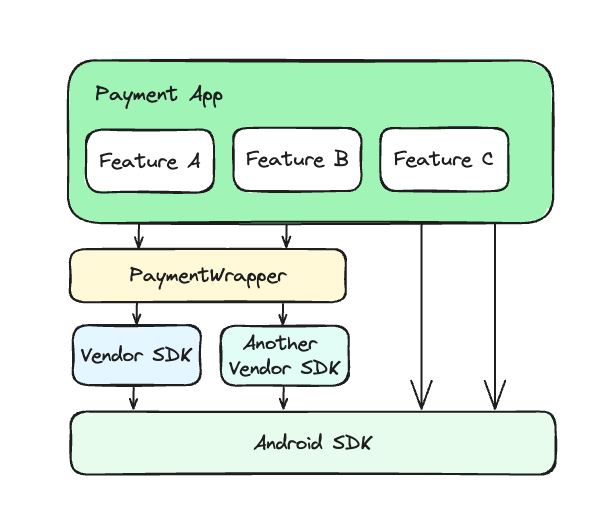 PaymentWrapper includedWith this approach, we can decide how we pass and receive data between the app and the VendorSDK. This extra layer will transform data and define the interface the app expects from third-party libraries.